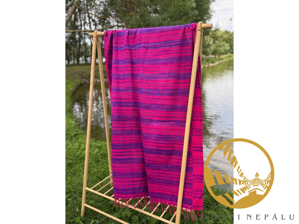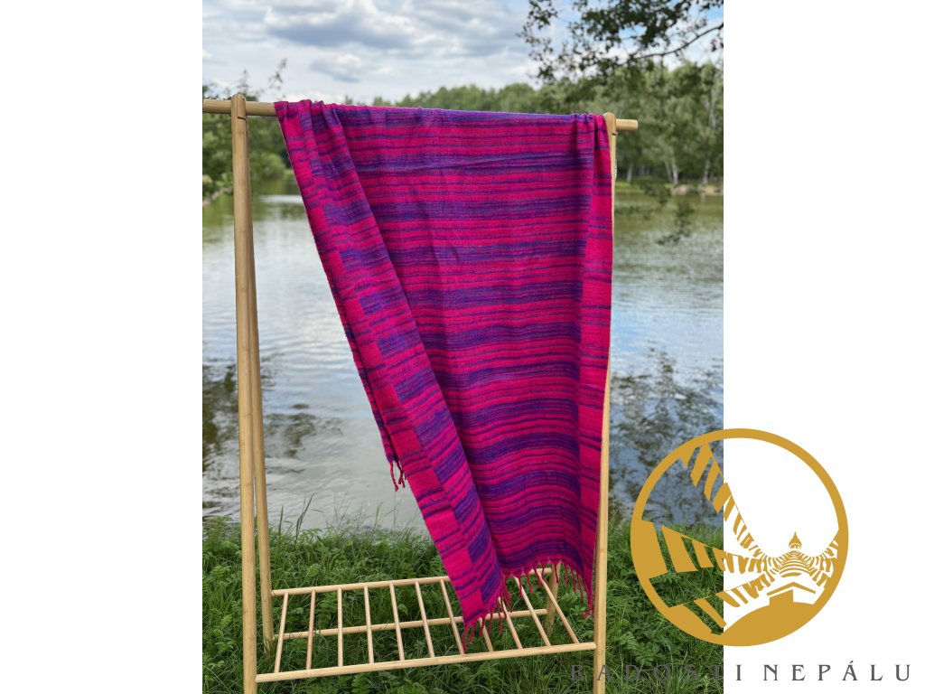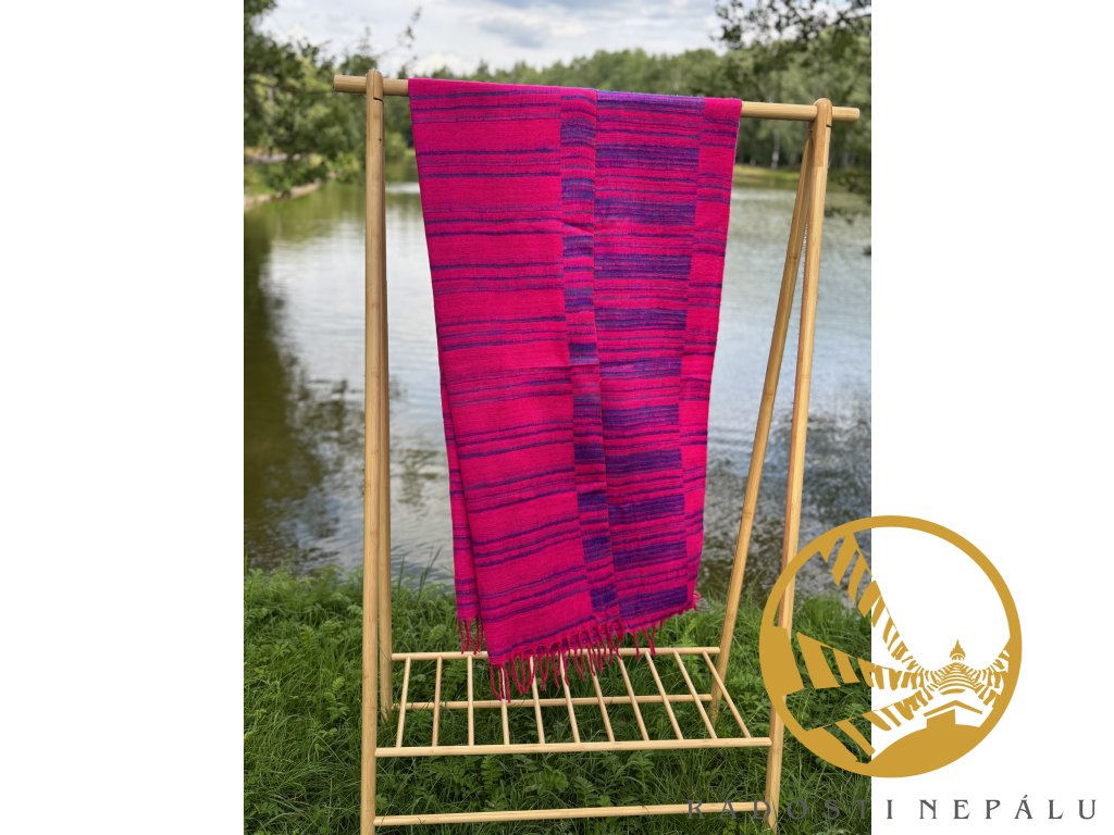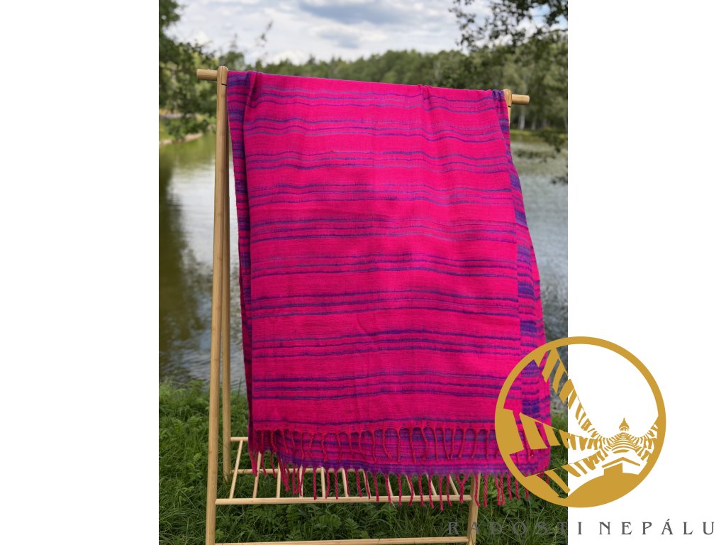 Velice příjemná deka je ručně utkána na tkalcovských strojích přímo v Nepálu. Deka má nádherné syté barvy a jedná se o originální kousek do domu nebo šatníku. Dá se nosit jako pléd nebo velká šála. Z vlastní zkušenosti je deka z jačí vlny ideální na procházky do přírody i s přespáním. Je velice hřejivá, skladná a velice lehká.
