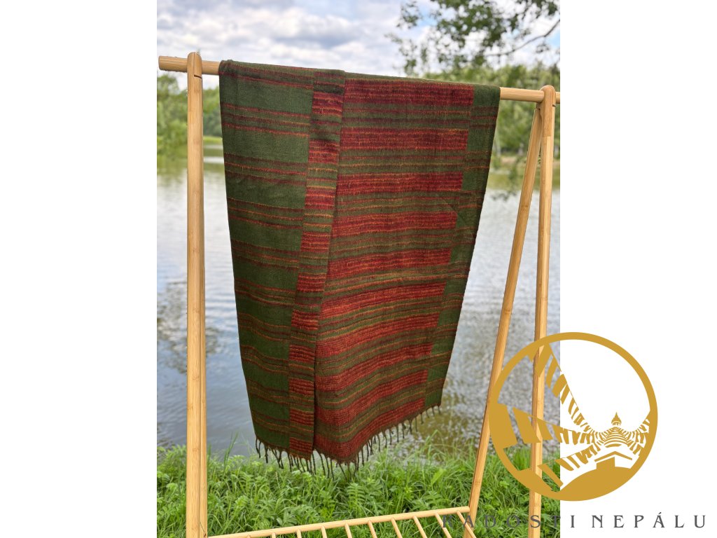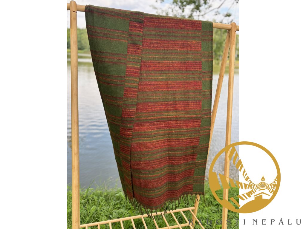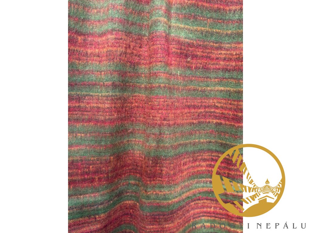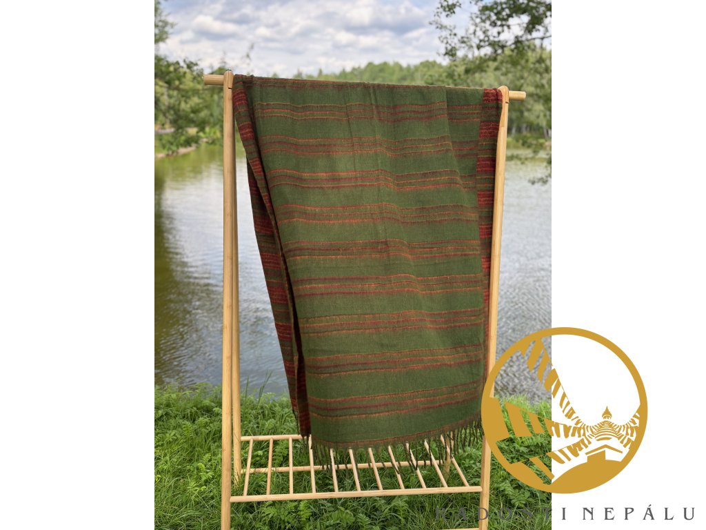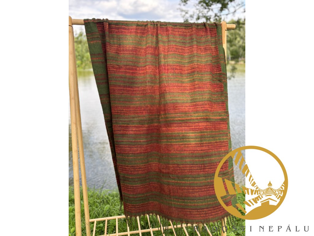 Velice příjemná deka je ručně utkána na tkalcovských strojích přímo v Nepálu. Deka má nádherné syté barvy a jedná se o originální kousek do domu nebo šatníku. Dá se nosit jako pléd nebo velká šála. Z vlastní zkušenosti je deka z jačí vlny ideální na procházky do přírody i s přespáním. Je velice hřejivá, skladná a velice lehká.